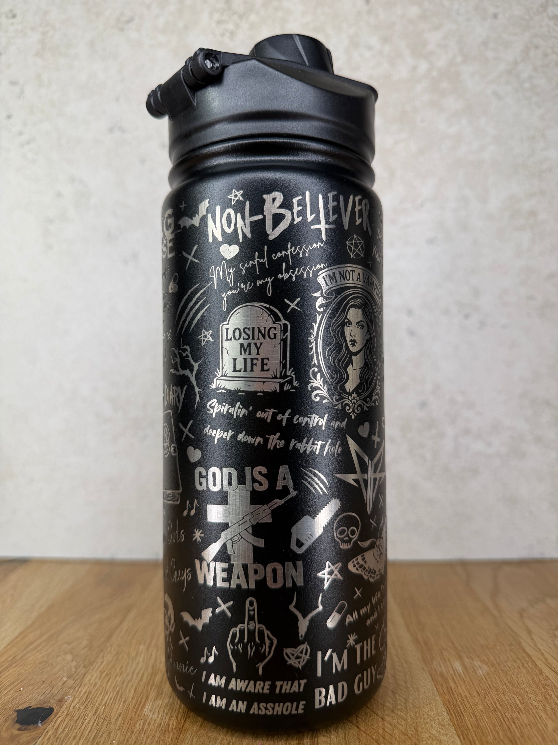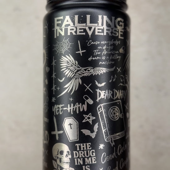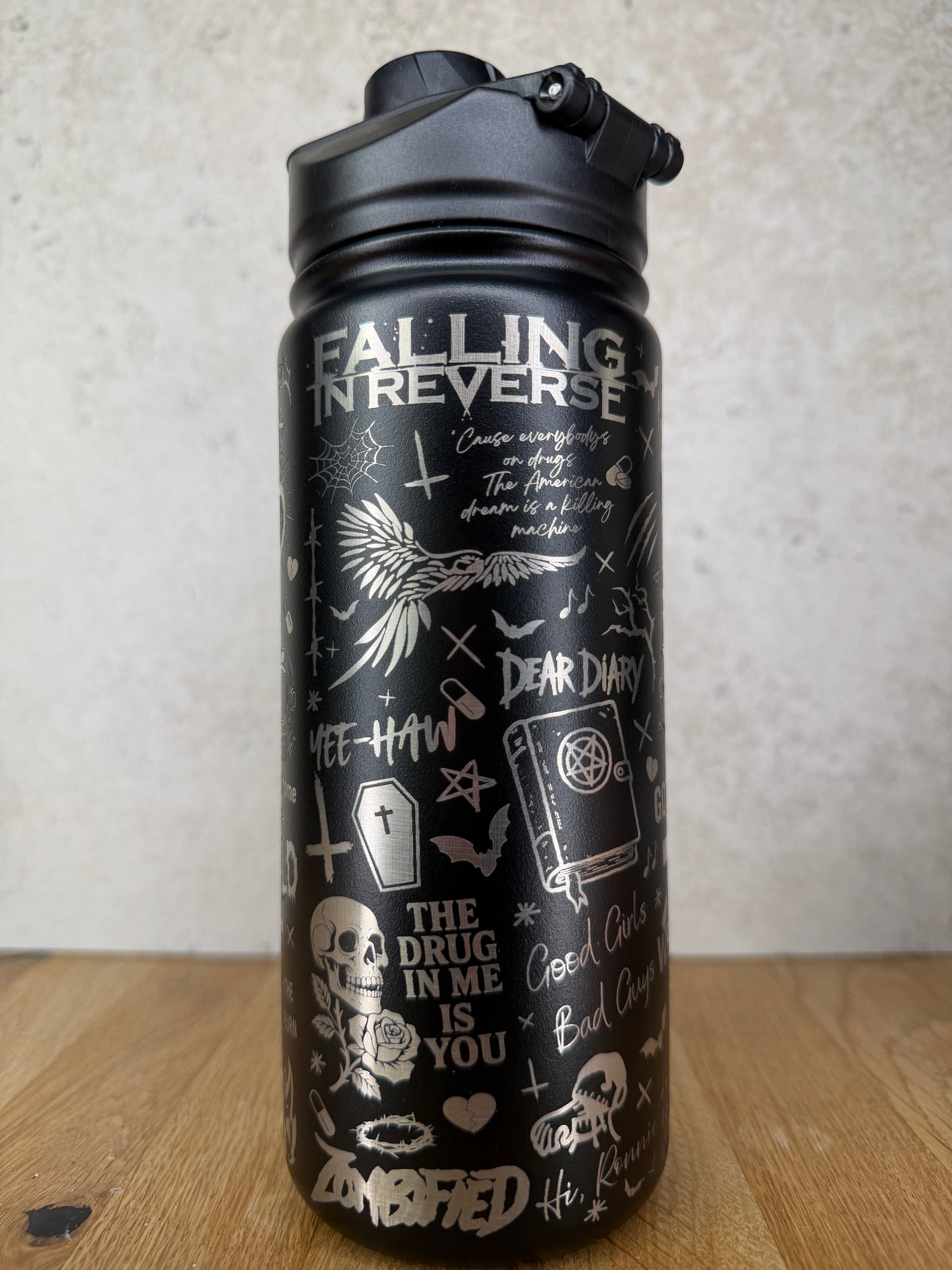 Diese von FIR inspirierte Kids Bottle ist das perfekte Accessoire für alle kleinen Rockstars, die schon jetzt Ronnie Radke und seine Musik lieben! Mit Symbolen, detailreichen Illustrationen und Motiven aus bekannten Songs wie „Losing My Life“, „The Drug in Me is You“ oder „Zombified“ bringt dieser Becher einen Hauch des rebellischen FIR-Styles in den Alltag – ohne zu düster zu wirken. Ob in der Schule, im Kindergarten oder unterwegs: Mit dieser Bottle zeigen die Kids, was sie feiern.