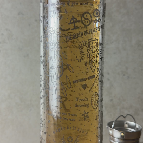 Die von BO inspirierte Tea Bottle ist das ultimative Accessoire für alle Fans der Band! Verziert mit ikonischen Symbolen und Zitaten aus ihren Songs, darunter kraftvolle Grafiken und düstere Motive, verkörpert dieser Becher den unverwechselbaren Stil der Band. Ob zu Hause, im Büro oder unterwegs, dieser Becher sorgt dafür, dass du deine Lieblingsmusik auch im Alltag repräsentieren kannst.