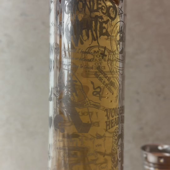 Die von MiW inspirierte Tea Bottle ist ein absolutes Must-have für alle, die den düsteren, okkulten und emotional intensiven Stil der Band lieben. Verziert mit ikonischen Symbolen, Zitaten und Illustrationen aus Songs wie Voices, Another Life oder Masterpiece, fängt diesee Bottle die ganze Ästhetik von MIW ein zwischen Schmerz, Verzweiflung und Stärke. Skelette, Pentagramme, Fledermäuse und tiefgehende Textzeilen verschmelzen zu einem kunstvollen Gesamtbild, das perfekt die dunkle Eleganz der Band widerspiegelt