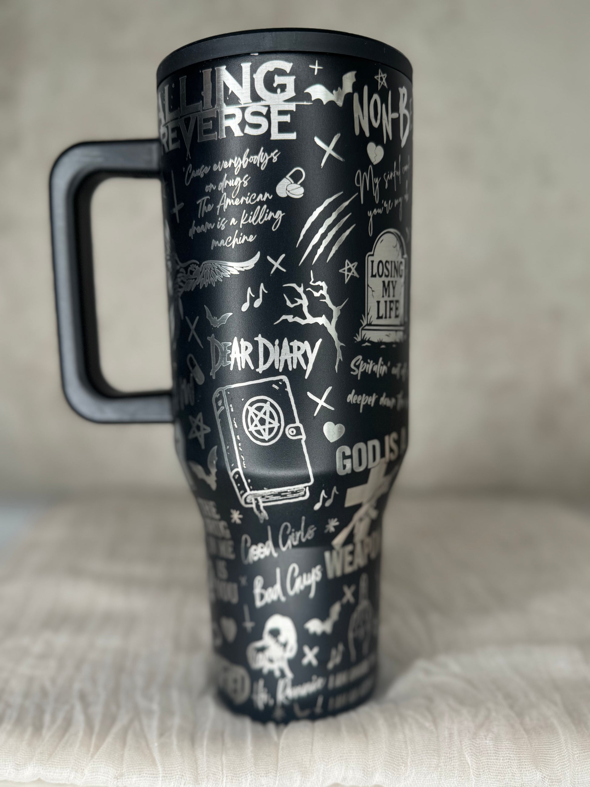 Der von FIR inspirierte Tumbler ist das perfekte Accessoire für alle, die Ronnie Radke und seine Musik feiern! Verziert mit ikonischen Symbolen, Zitaten und kraftvollen Illustrationen aus den bekanntesten Songs wie „Losing My Life“, „The Drug in Me is You“ oder „Zombified“, bringt dieser Becher den rebellischen, düsteren und provokanten Stil der Band direkt in deinen Alltag. Egal ob zuhause, im Büro oder unterwegs – mit diesem Tumbler zeigst du jedem, was du hörst und wofür du stehst.