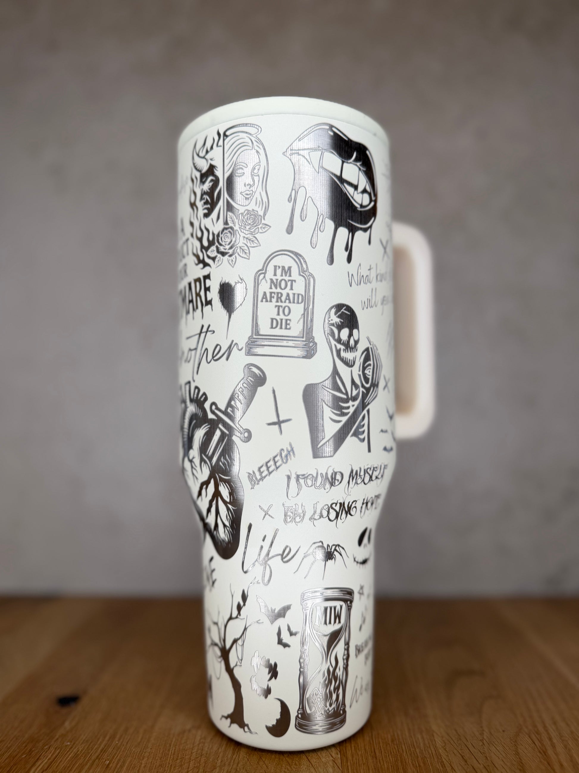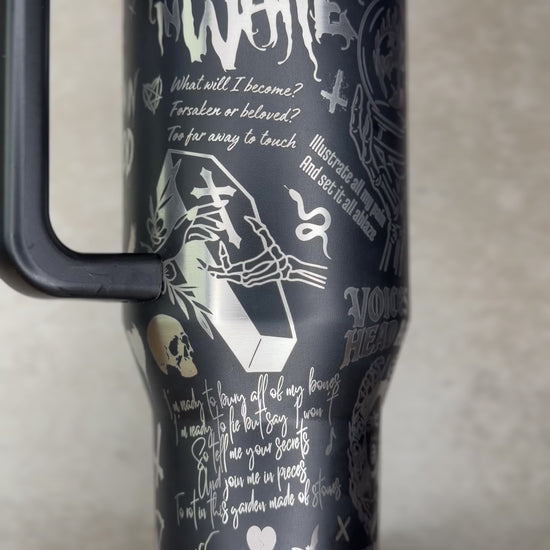 Der von MiW inspirierte Tumbler ist ein absolutes Must-have für alle, die den düsteren, okkulten und emotional intensiven Stil der Band lieben. Verziert mit ikonischen Symbolen, Zitaten und Illustrationen aus Songs wie Voices, Another Life oder Masterpiece, fängt dieser Becher die ganze Ästhetik von MIW ein zwischen Schmerz, Verzweiflung und Stärke. Skelette, Pentagramme, Fledermäuse und tiefgehende Textzeilen verschmelzen zu einem kunstvollen Gesamtbild, das perfekt die dunkle Eleganz der Band widerspiegelt