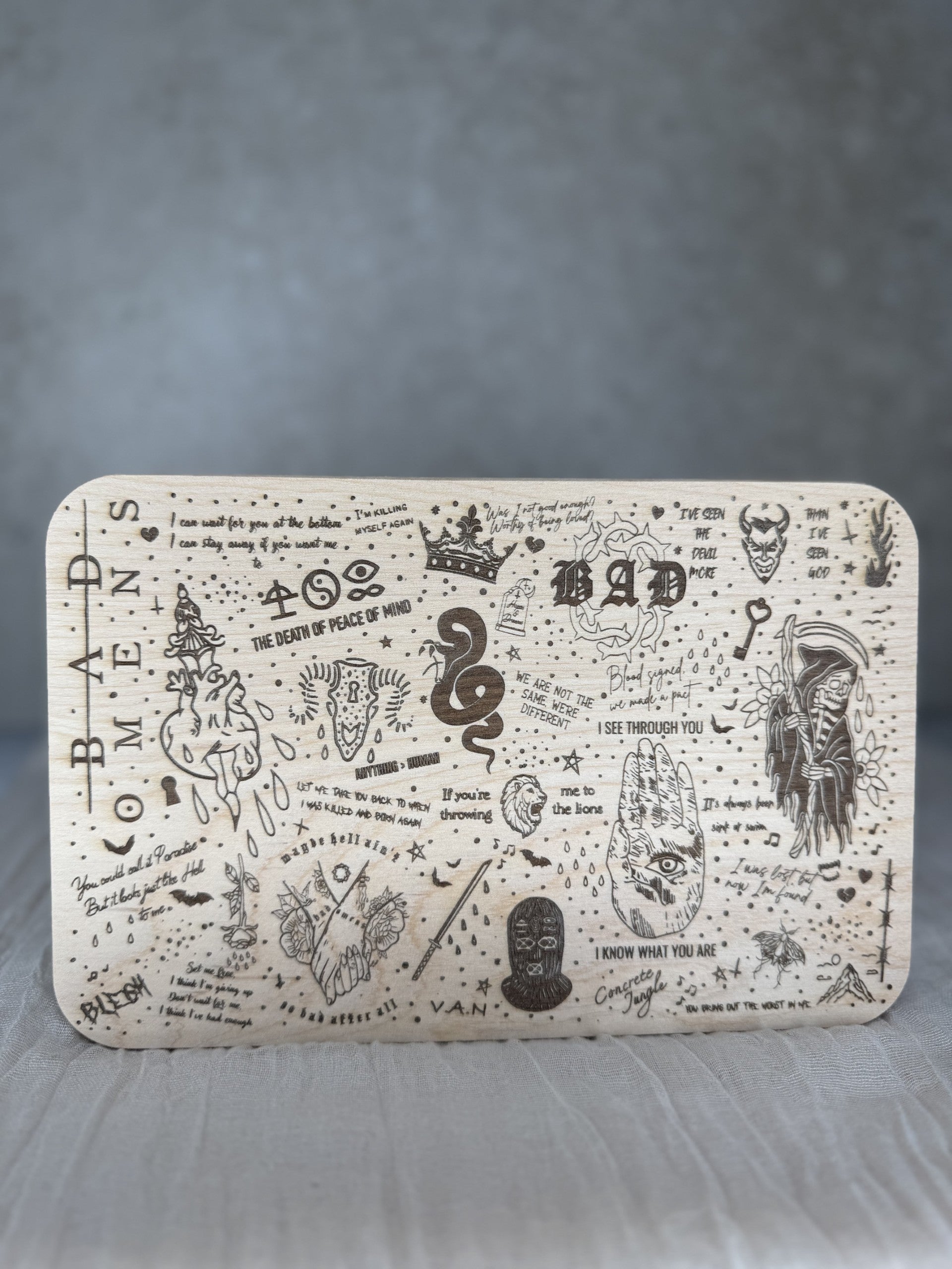 Unser von BO inspiriertes Frühstücksbrettchen bringt die dunkle, atmosphärische und kraftvolle Energie der Band direkt auf deinen Frühstückstisch. Verziert mit ikonischen Symbolen, Zitaten und Illustrationen aus den bekanntesten Songs wie „The Death of Peace of Mind“, „Like a Villain“ oder „Just Pretend“, ist dieses Brettchen nicht nur ein Küchen-Accessoire – es ist ein Statement.