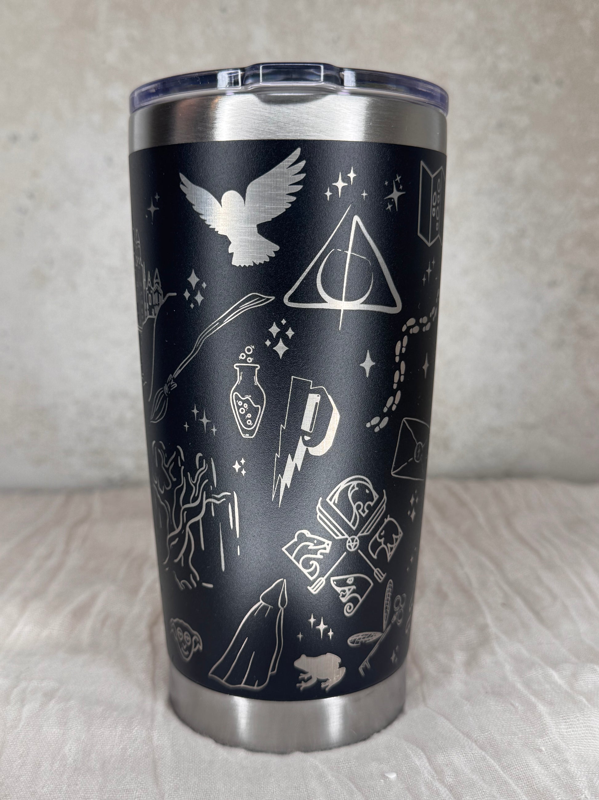 Dieser Coffee Cup bringt ein Stück Zauber direkt in deinen Alltag. Verziert mit mystischen Symbolen wie einer runden Brille, einem leuchtenden Schutzgeist und einem majestätischen Schloss erinnert er an Geschichten voller Magie, Freundschaft und Abenteuer. Ob zu Hause, unterwegs oder im Büro – mit diesem Becher hast du immer ein kleines bisschen Zauberwelt bei dir.