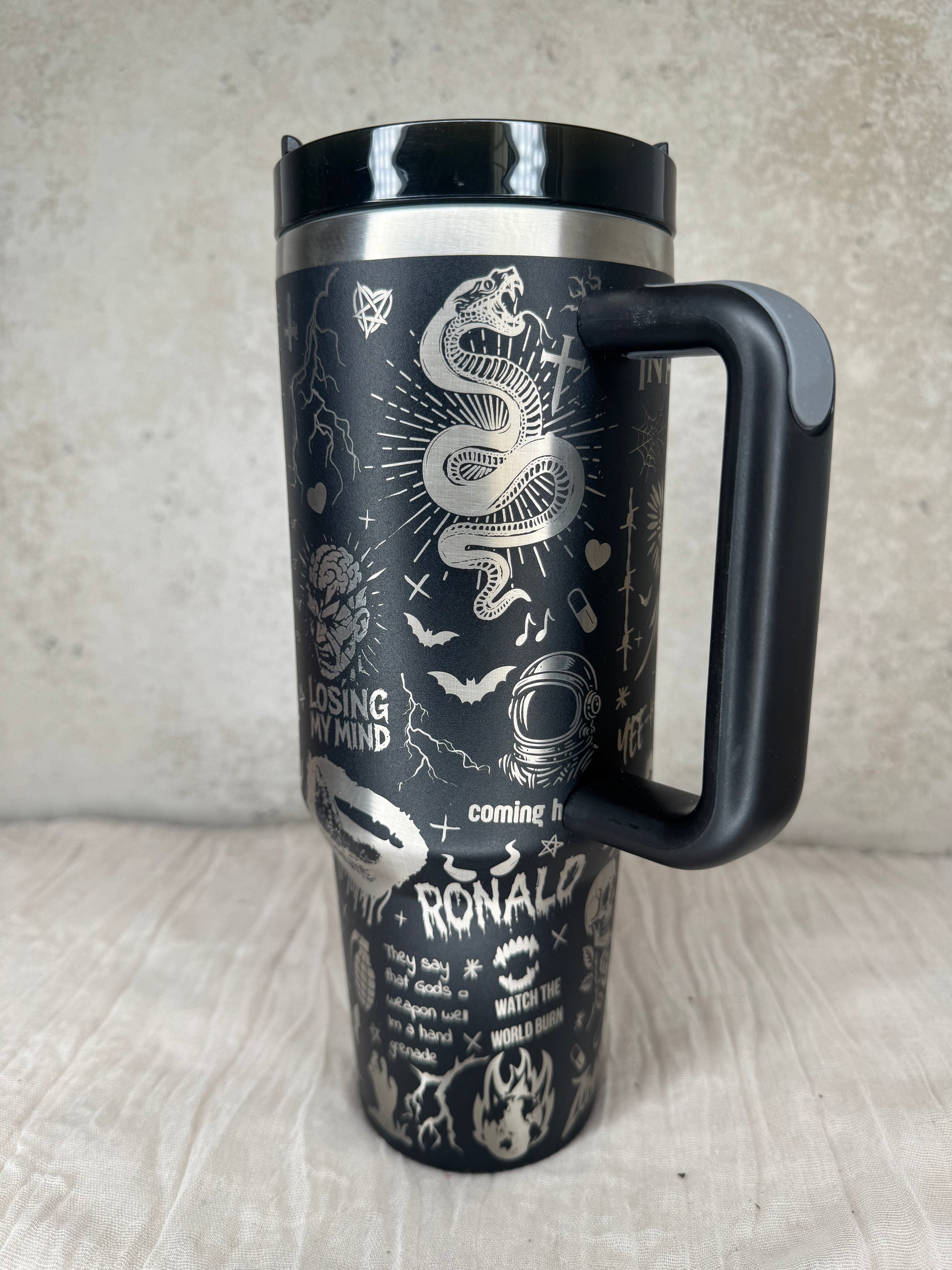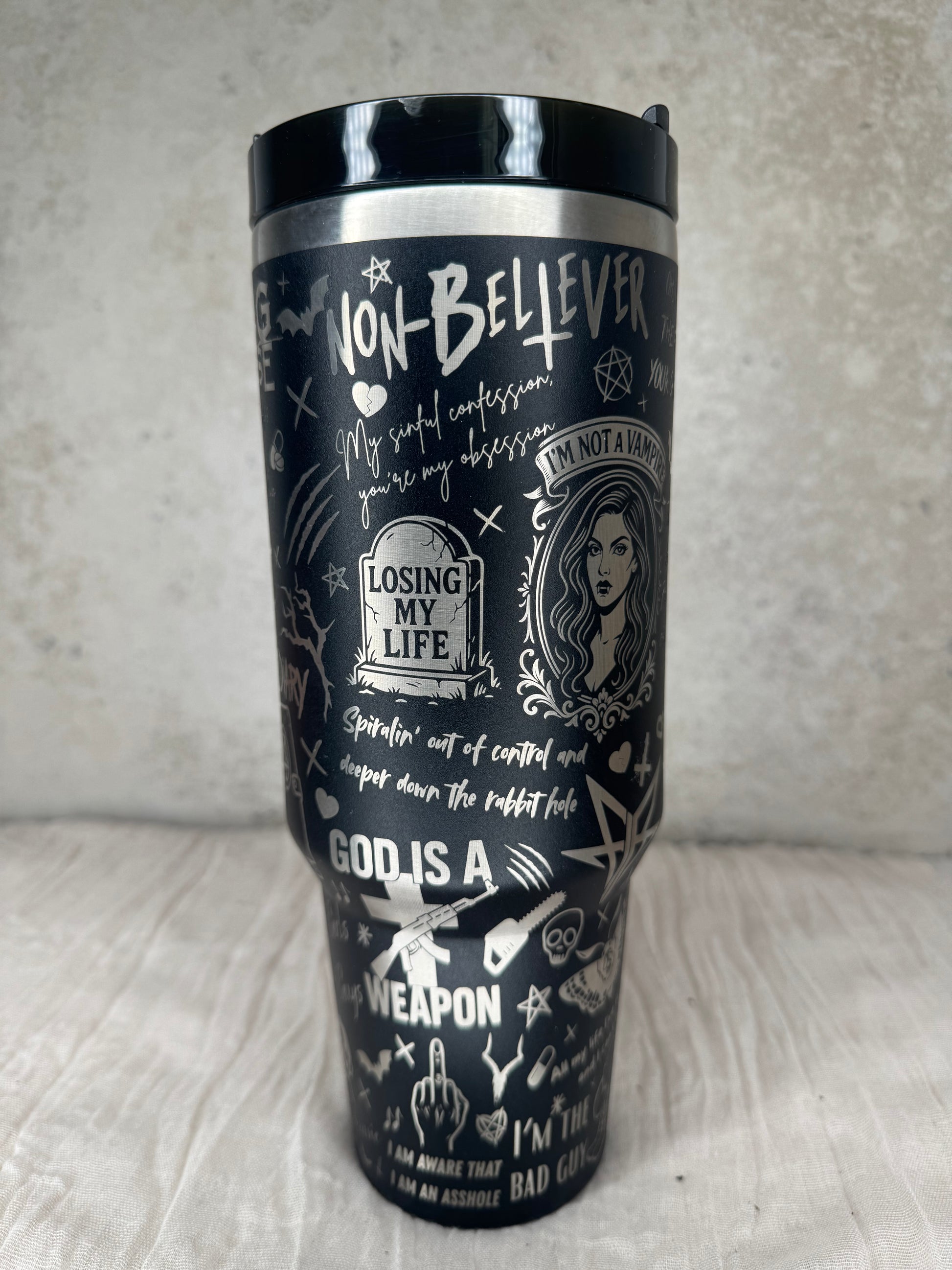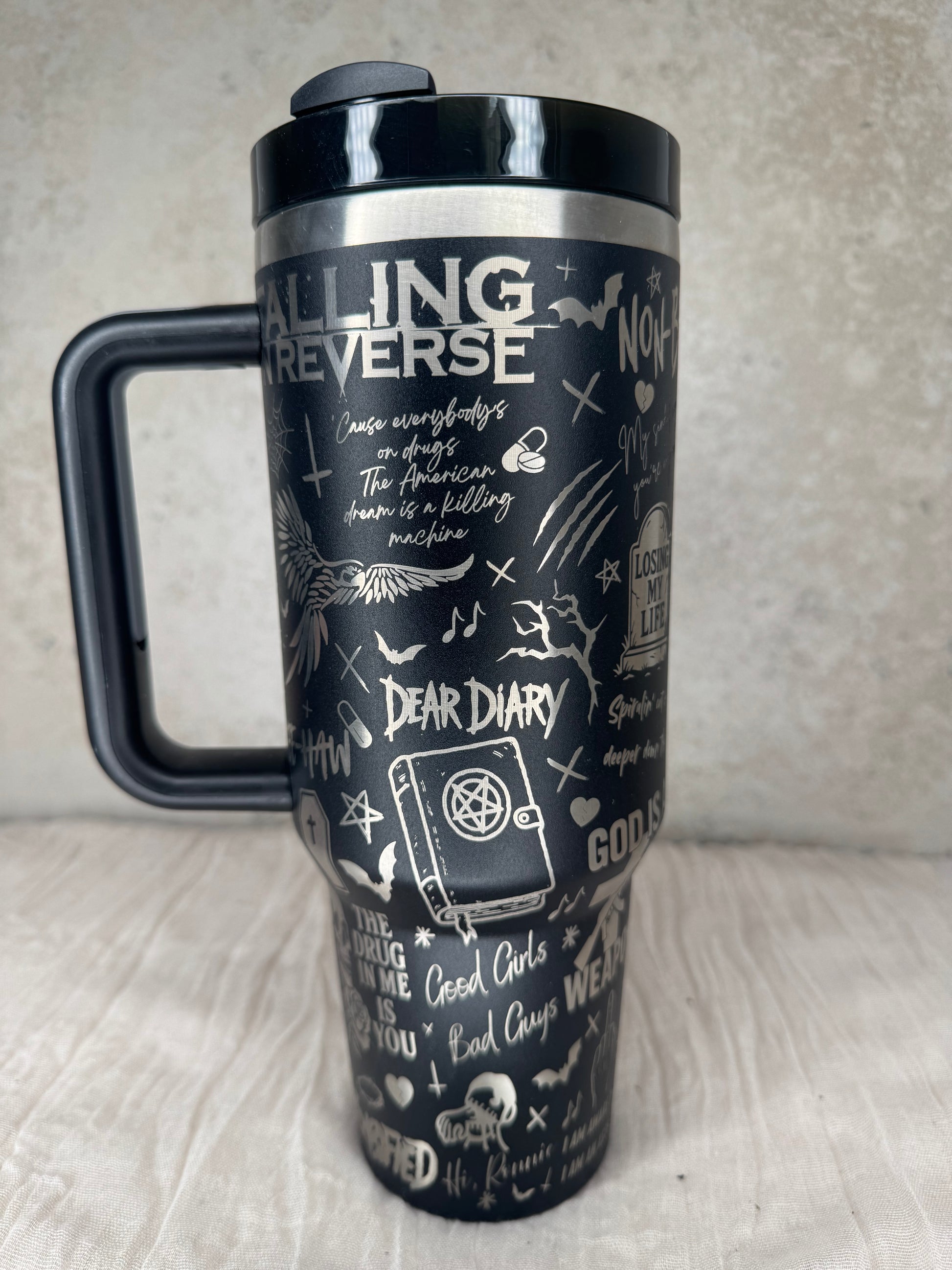 Der von FIR inspirierte Tumbler ist das perfekte Accessoire für alle, die Ronnie Radke und seine Musik feiern! Verziert mit ikonischen Symbolen, Zitaten und kraftvollen Illustrationen aus den bekanntesten Songs wie „Losing My Life“, „The Drug in Me is You“ oder „Zombified“, bringt dieser Becher den rebellischen, düsteren und provokanten Stil der Band direkt in deinen Alltag. Egal ob zuhause, im Büro oder unterwegs – mit diesem Tumbler zeigst du jedem, was du hörst und wofür du stehst.